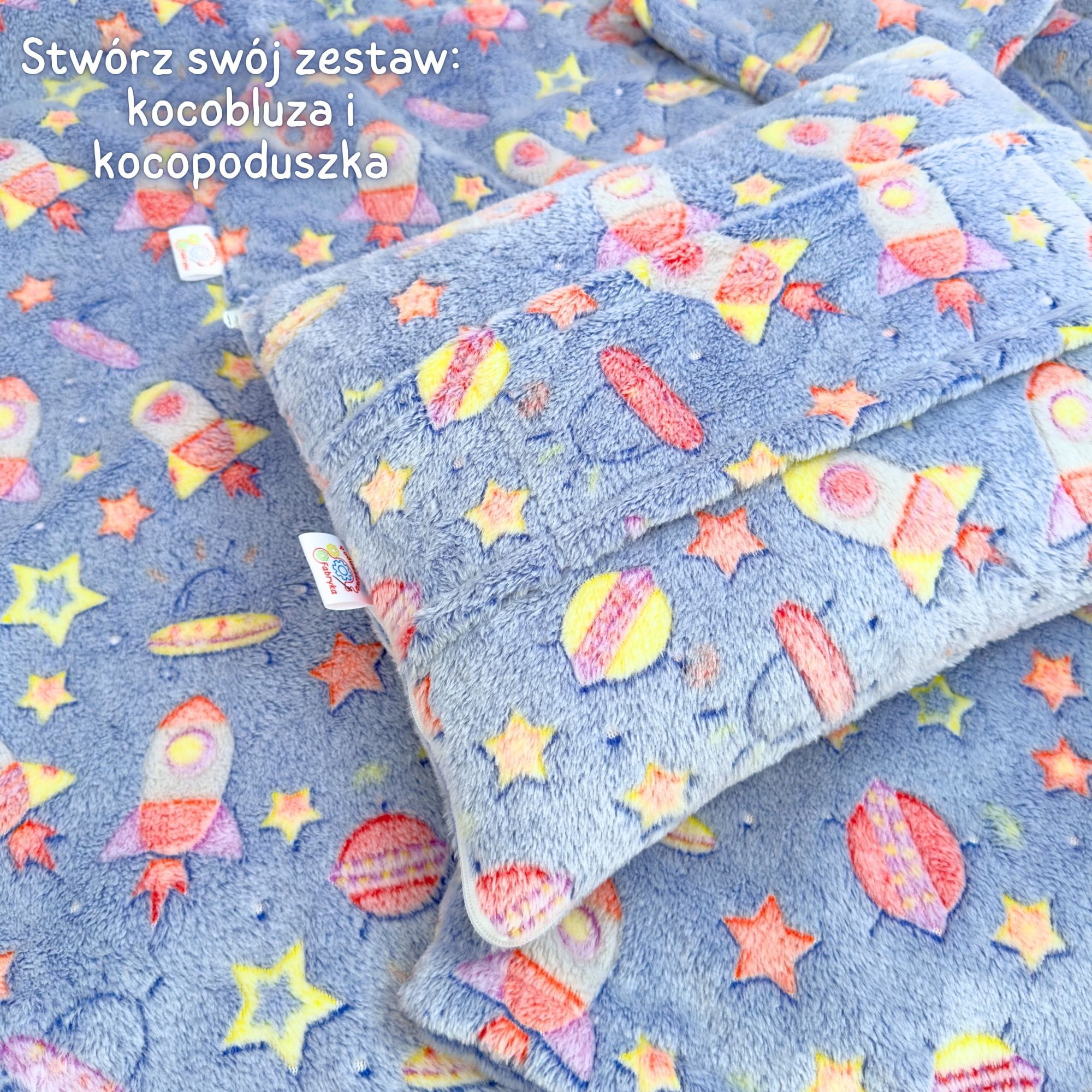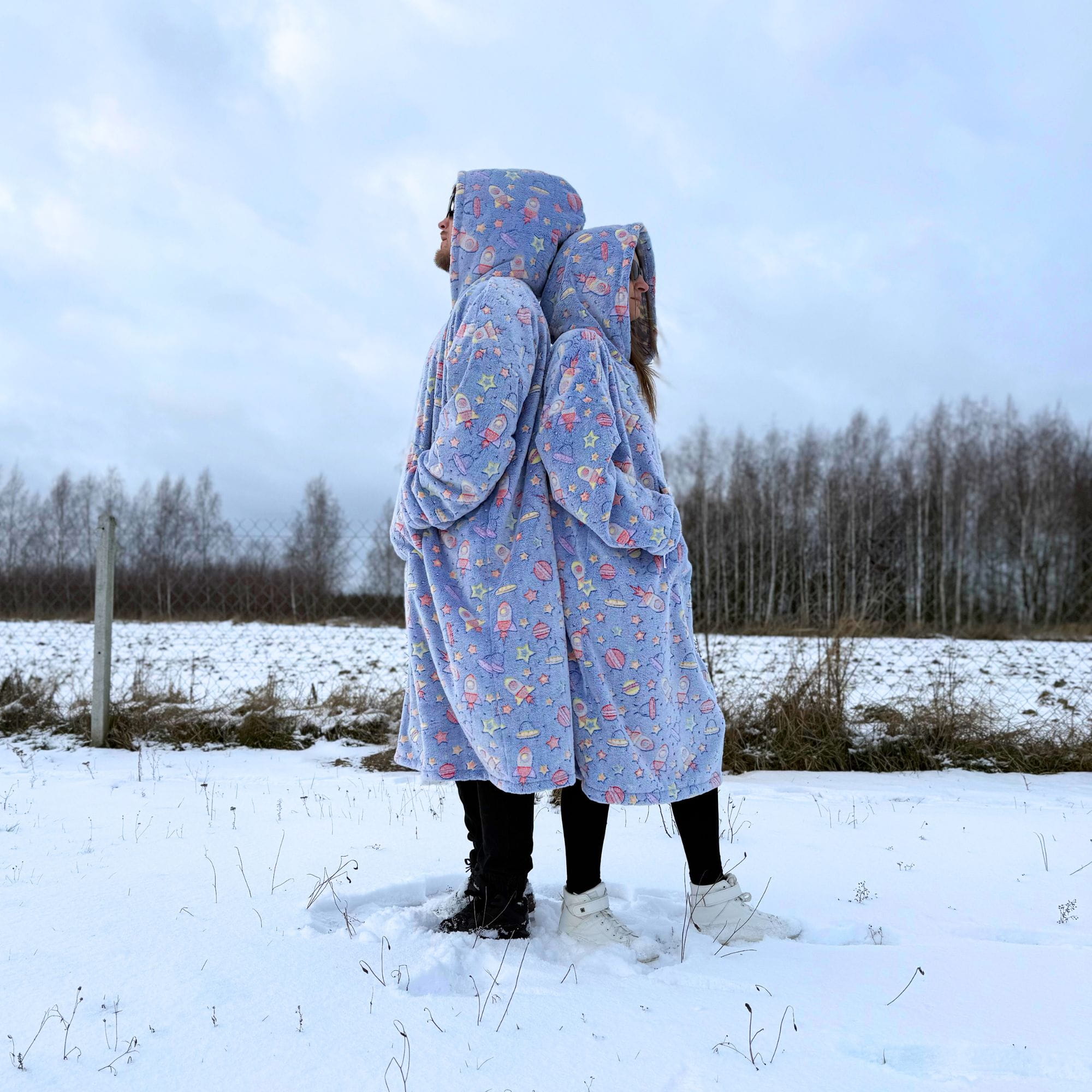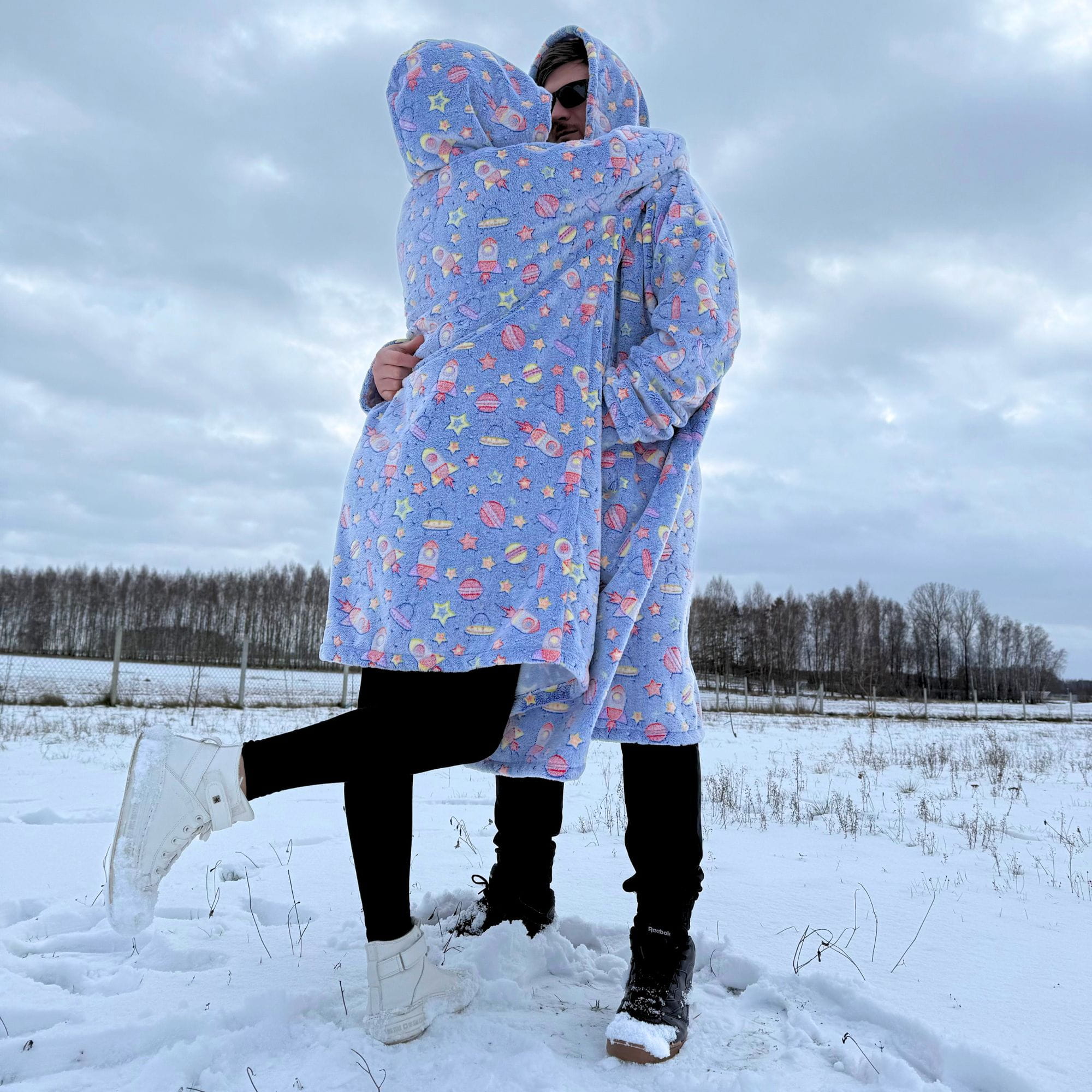 Kocobluza dla dorosłych w rakiety delikatnie świecąca w ciemności – ciepła bluza koc oversize z kapturem i kieszenią | różne rozmiary