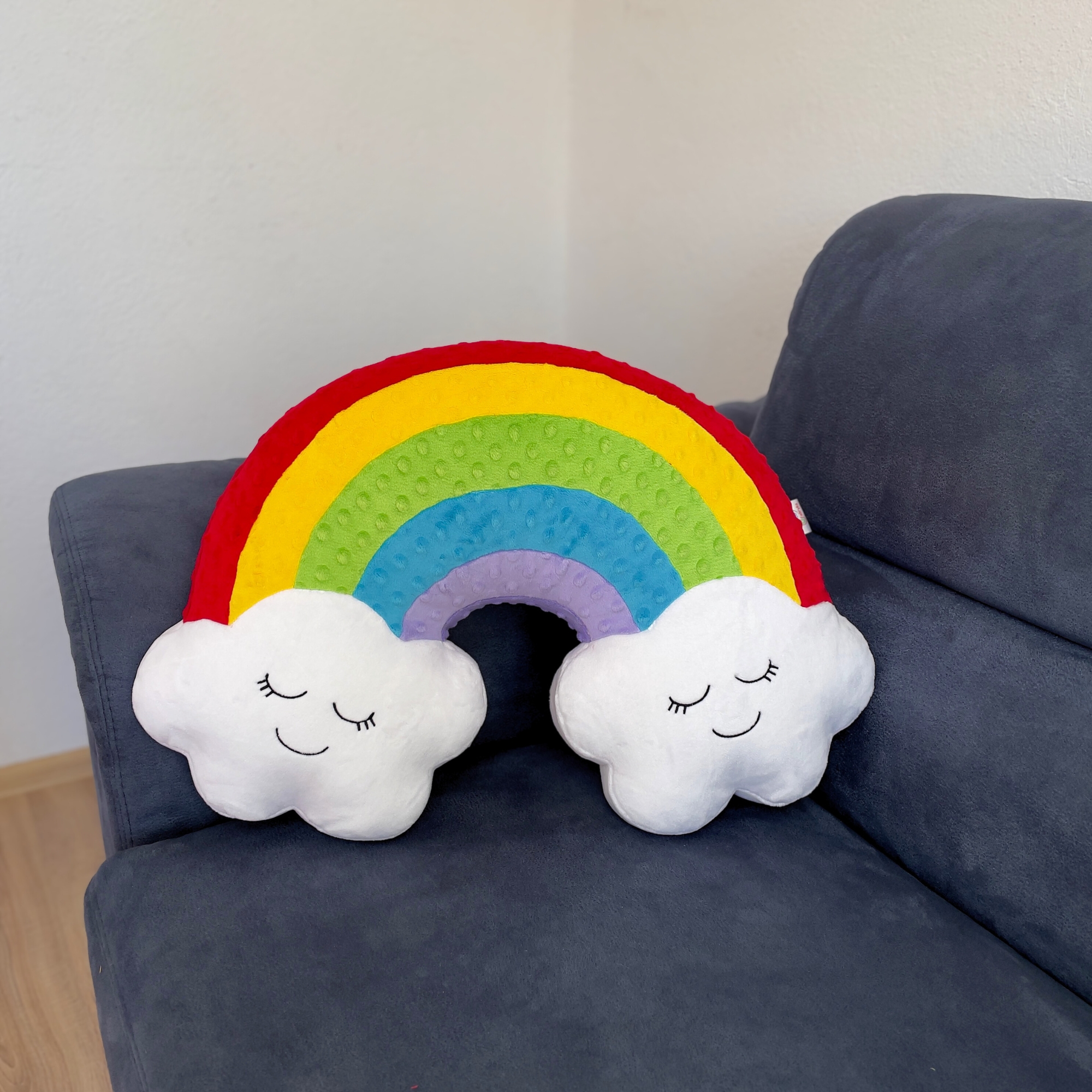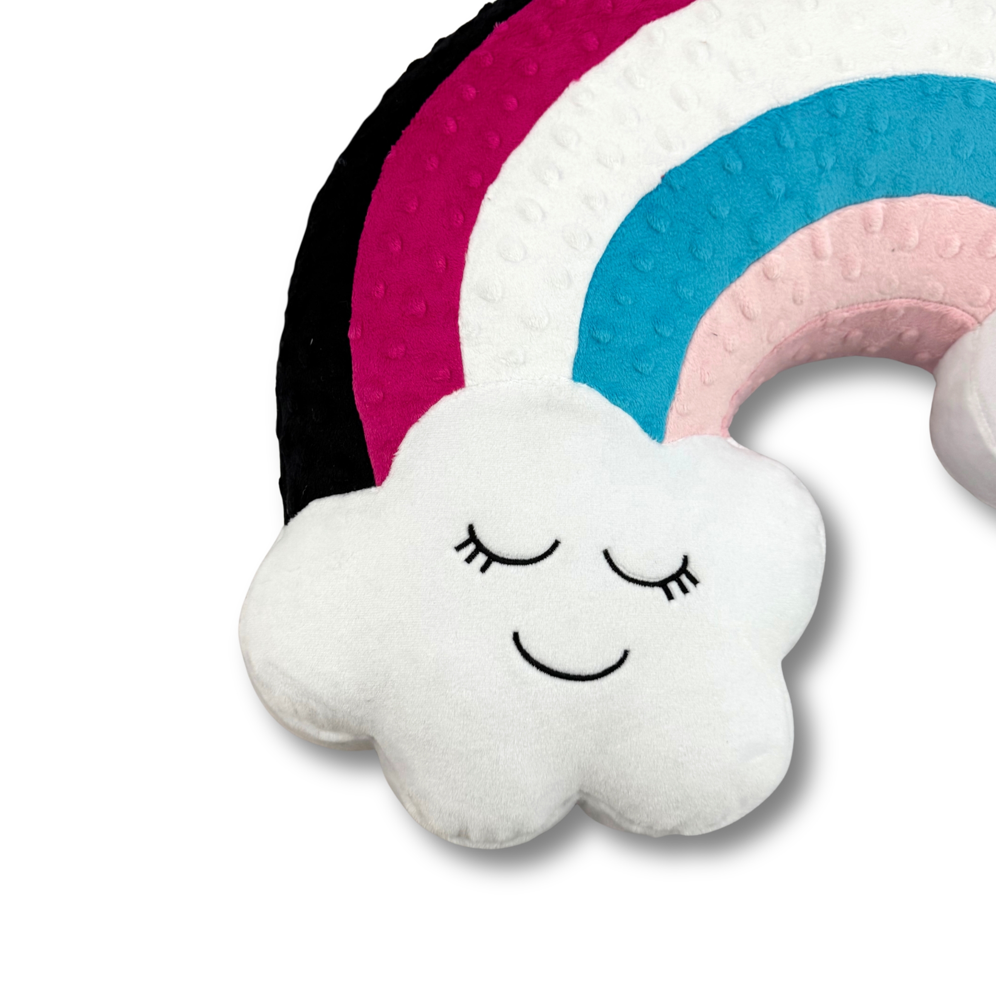 Poduszka została zaprojektowana z myślą o estetyce, wygodzie i możliwościach personalizacji. Miękkie chmurki na dole mają z jednej strony urocze, wyhaftowane buźki, które dodają całości dziecięcego uroku. Z drugiej strony pozostają gładkie – dzięki temu na jednej z nich można wykonać haft z imieniem, krótkim napisem lub dedykacją, tworząc niepowtarzalną pamiątkę.